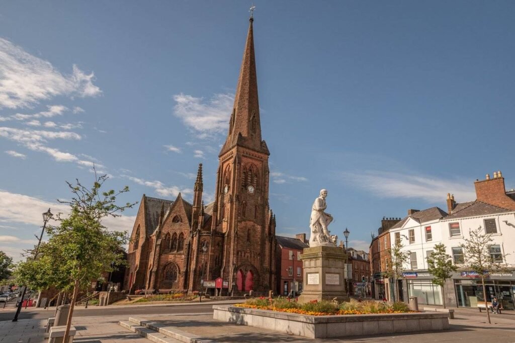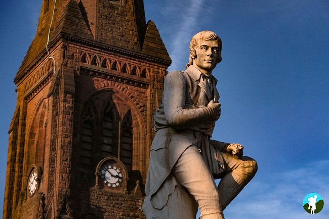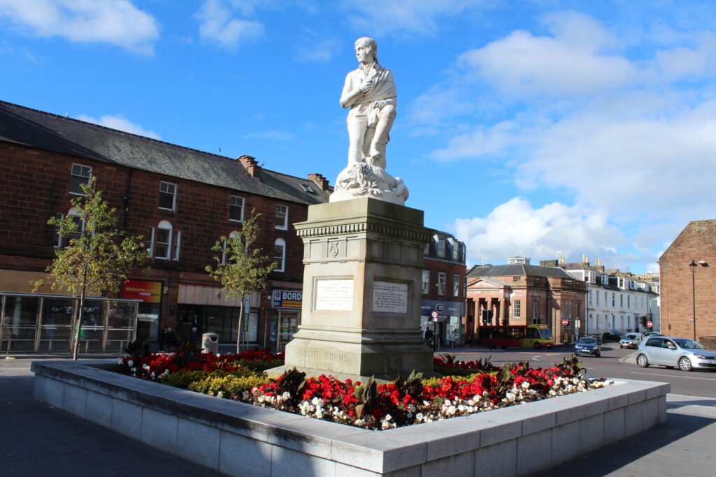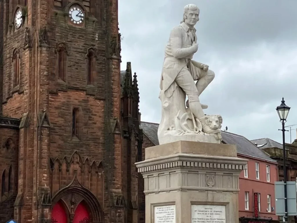 The Robert Burns Statue in Dumfries is an 1882 Carrara marble monument by Amelia Paton Hill, showing Burns seated with a dog at his feet on a sandstone plinth.